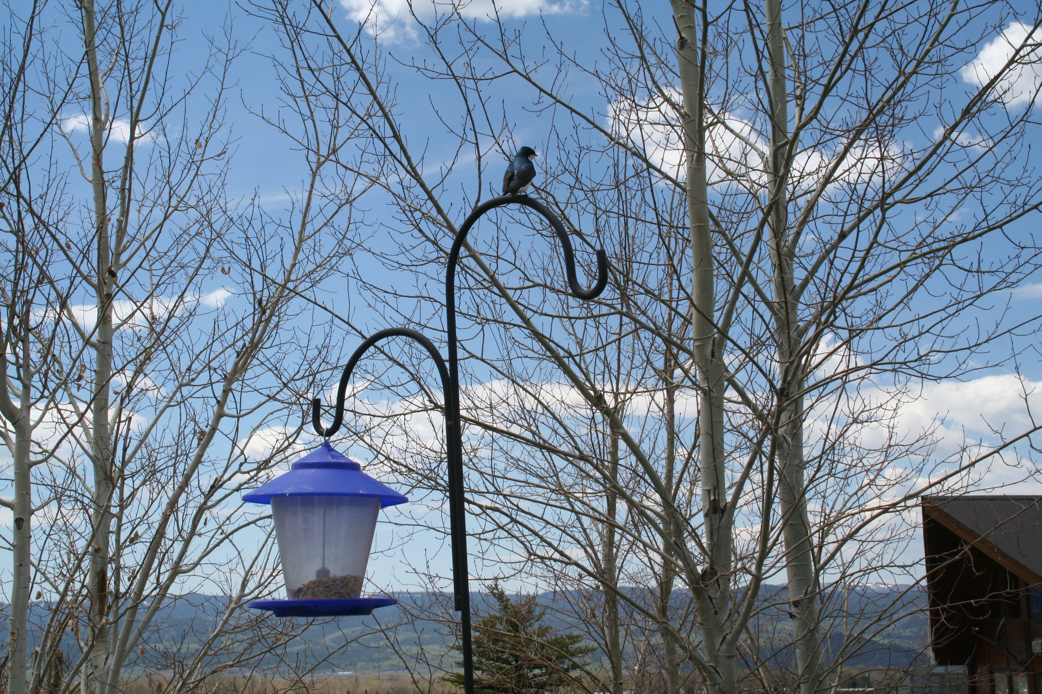 My husband, Bob, mentioned that I was remiss in not mentioning that the male acts as sentinel during the egg laying process. He perches for endless amounts of time on a nearby feeder while the female tends to her business inside the bird house. The papa bird looks like a man sitting in the car waiting while his wife shops… the difference being that a man will probably be reading a book while the bird is constantly monitoring the goings-on around them.